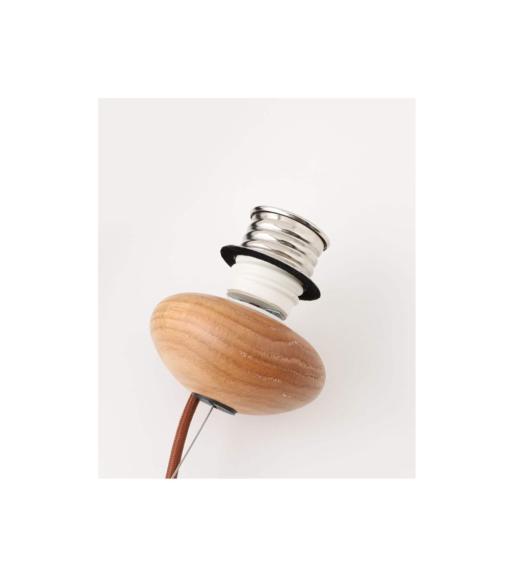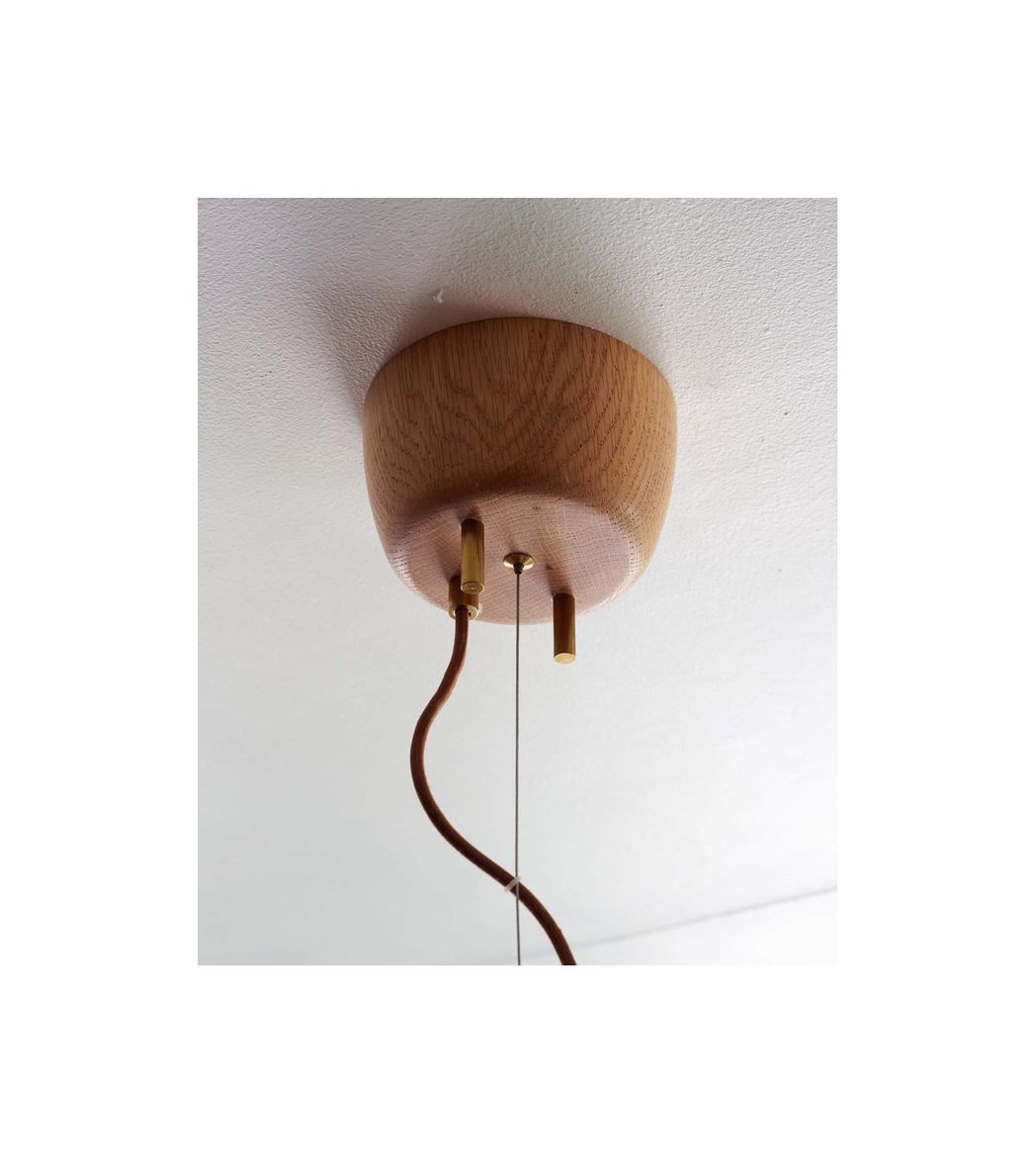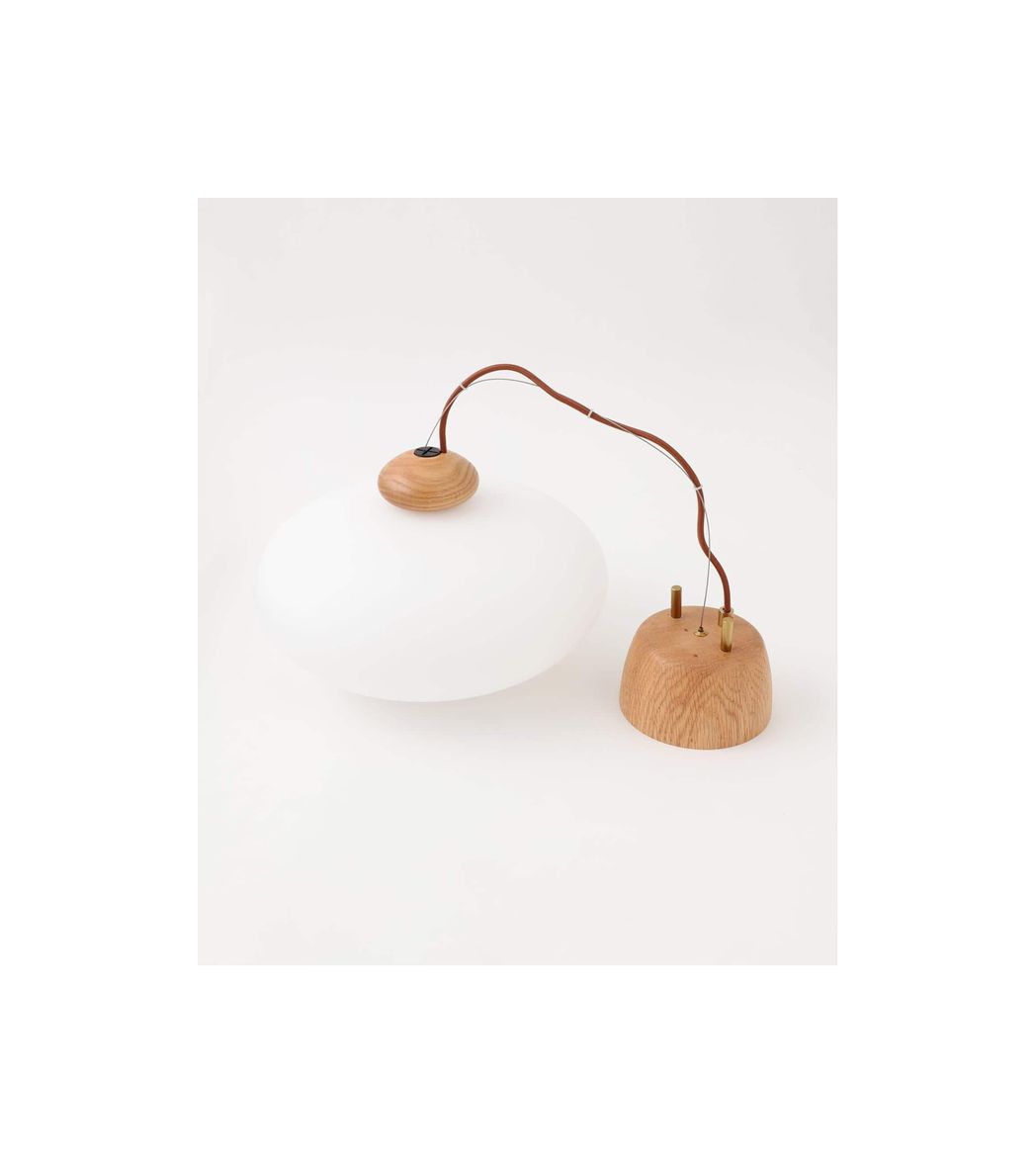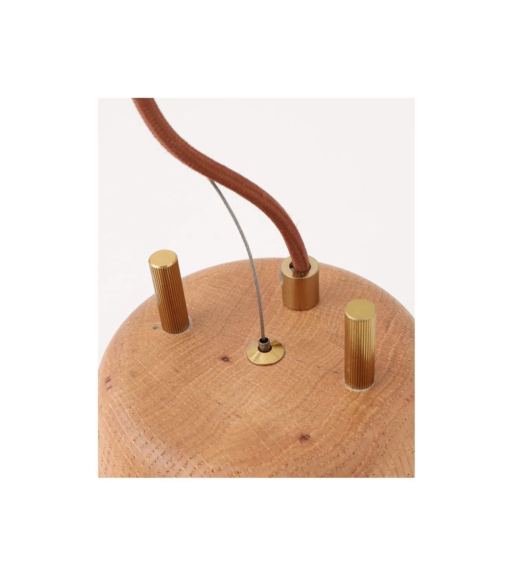 家具にも使われるオーク無垢材を削り出して仕上げた部材を使用したペンダントランプ。