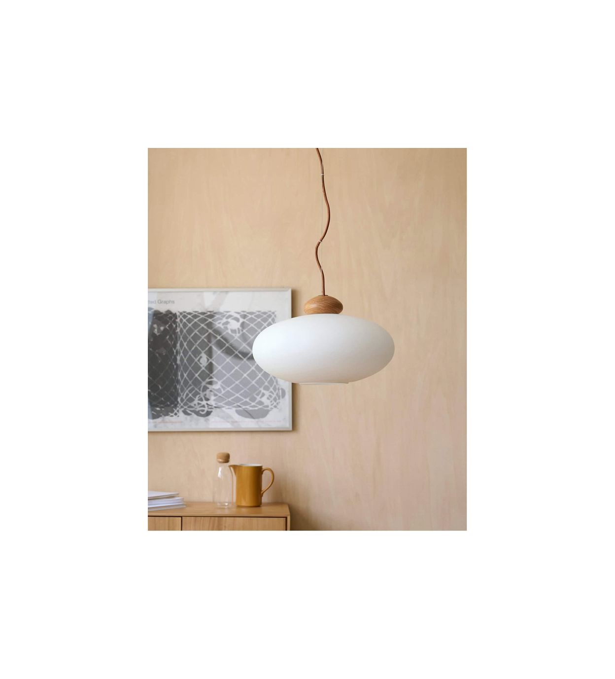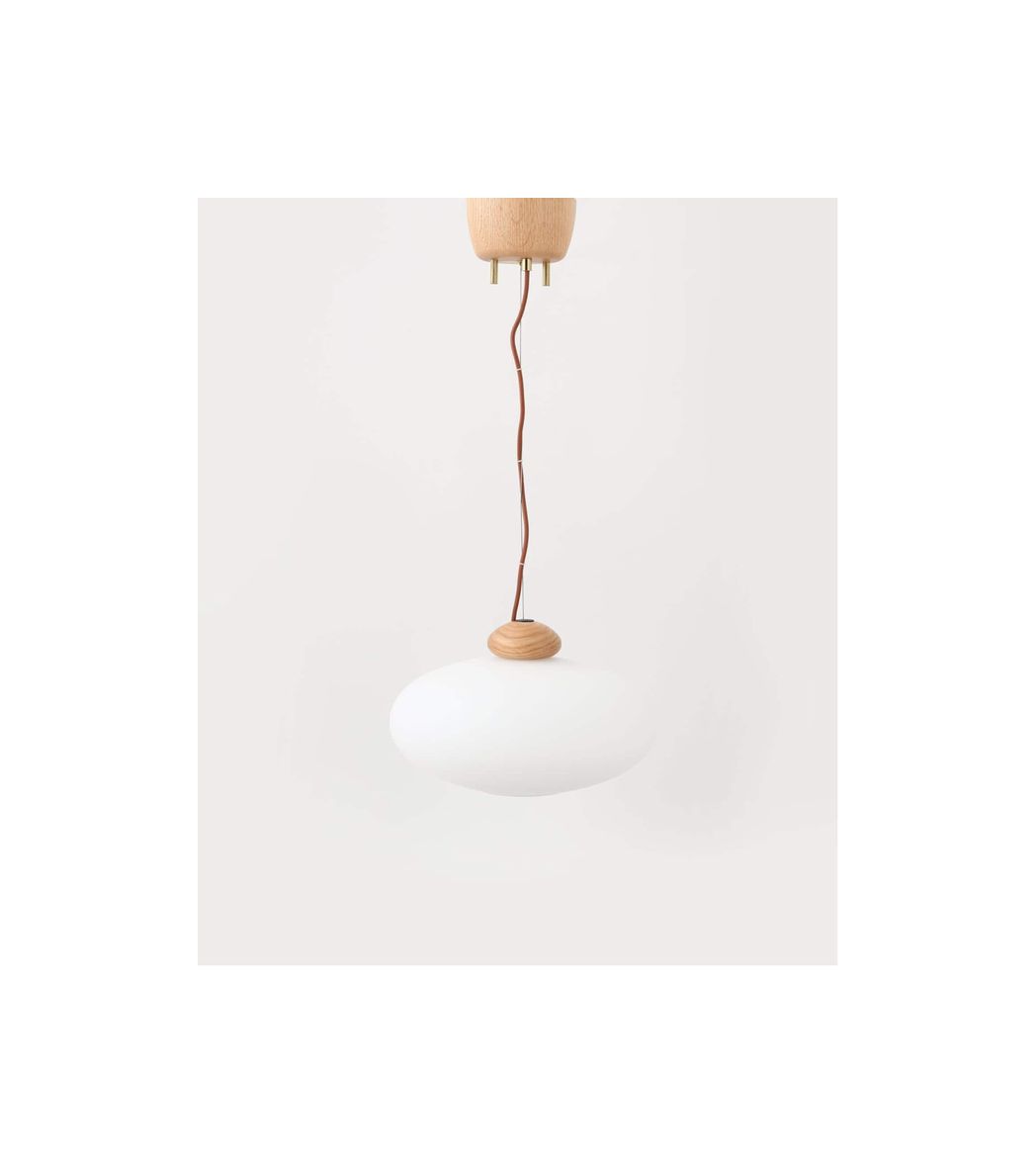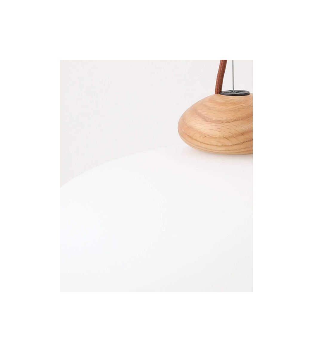 家具にも使われるオーク無垢材を削り出して仕上げた部材を使用したペンダントランプ。