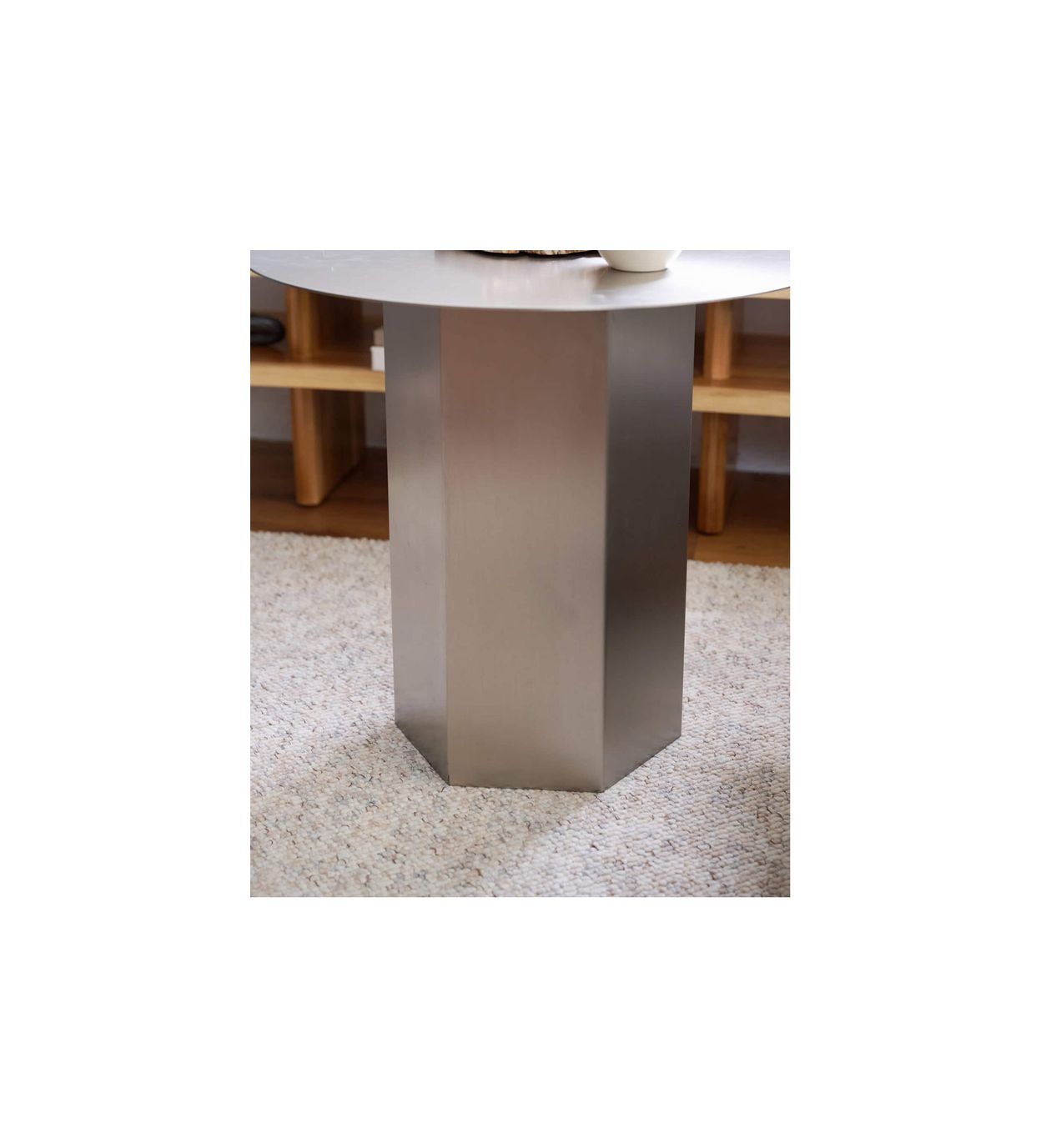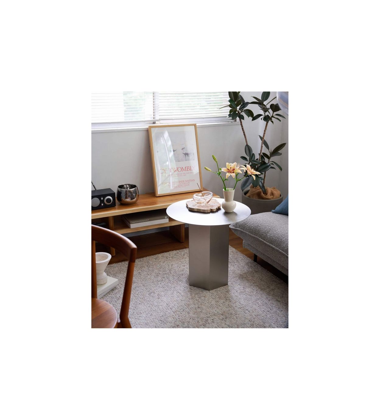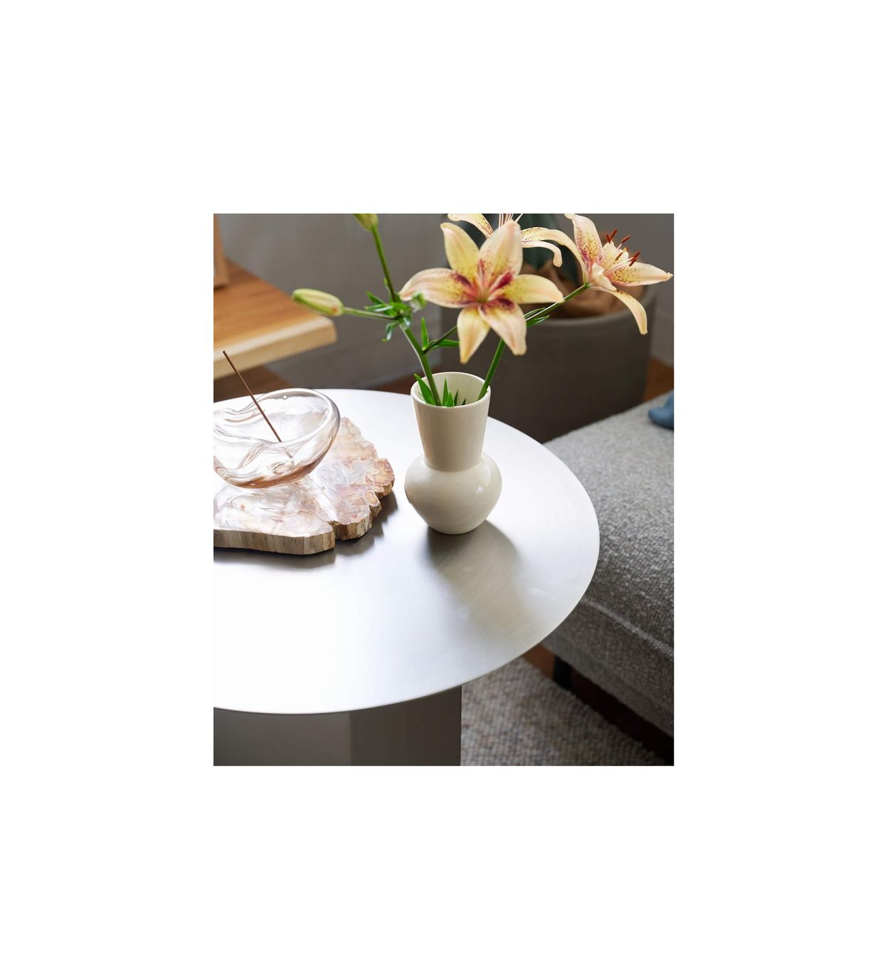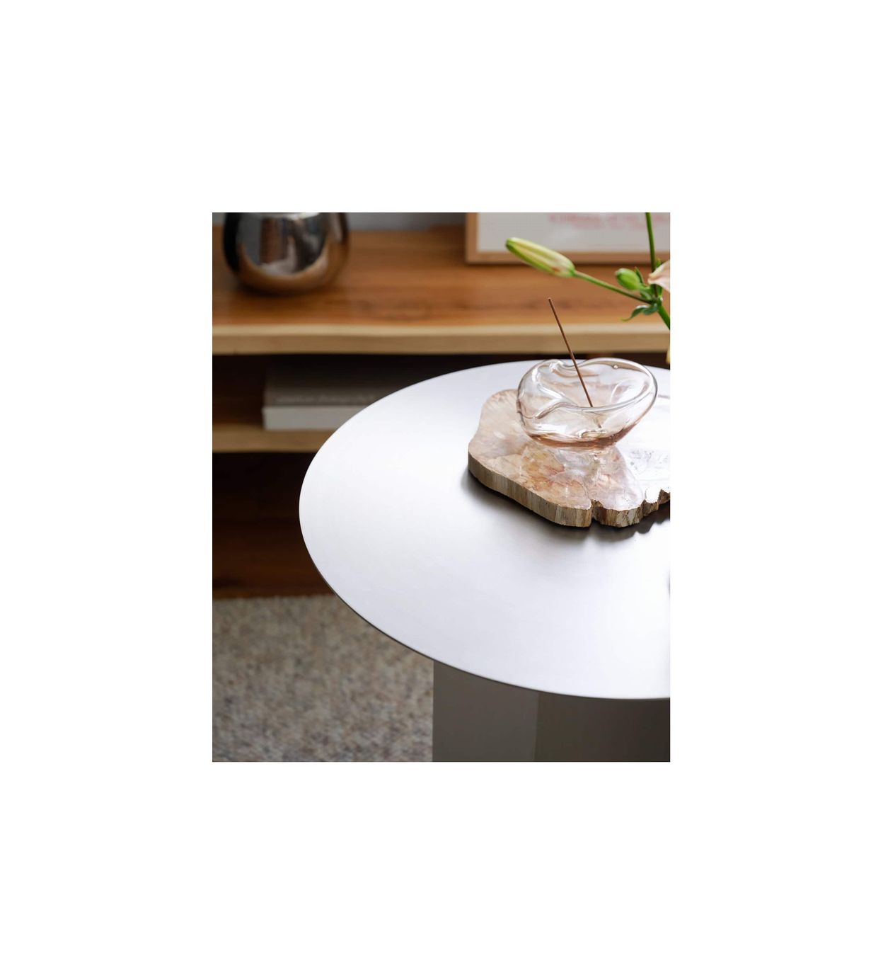 カップや書籍を置くのはもちろん、花器やオブジェを飾る台としても美しく映え、日常のワンシーンを引き立てます。