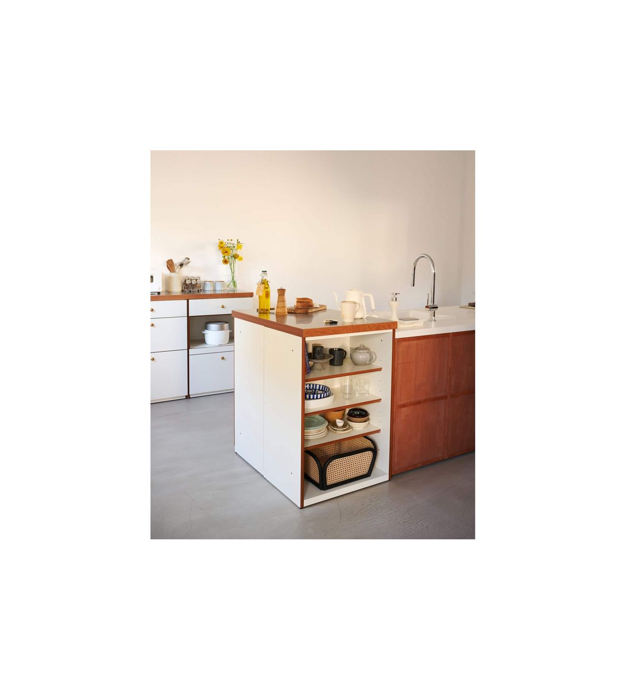 家電を含め、白を基調とした構成になりやすいキッチン空間に自然となじみながらも、クリーンさの中にどこか懐かしさを感じさせる、少しノスタルジックな佇まいを目指してデザインしました。