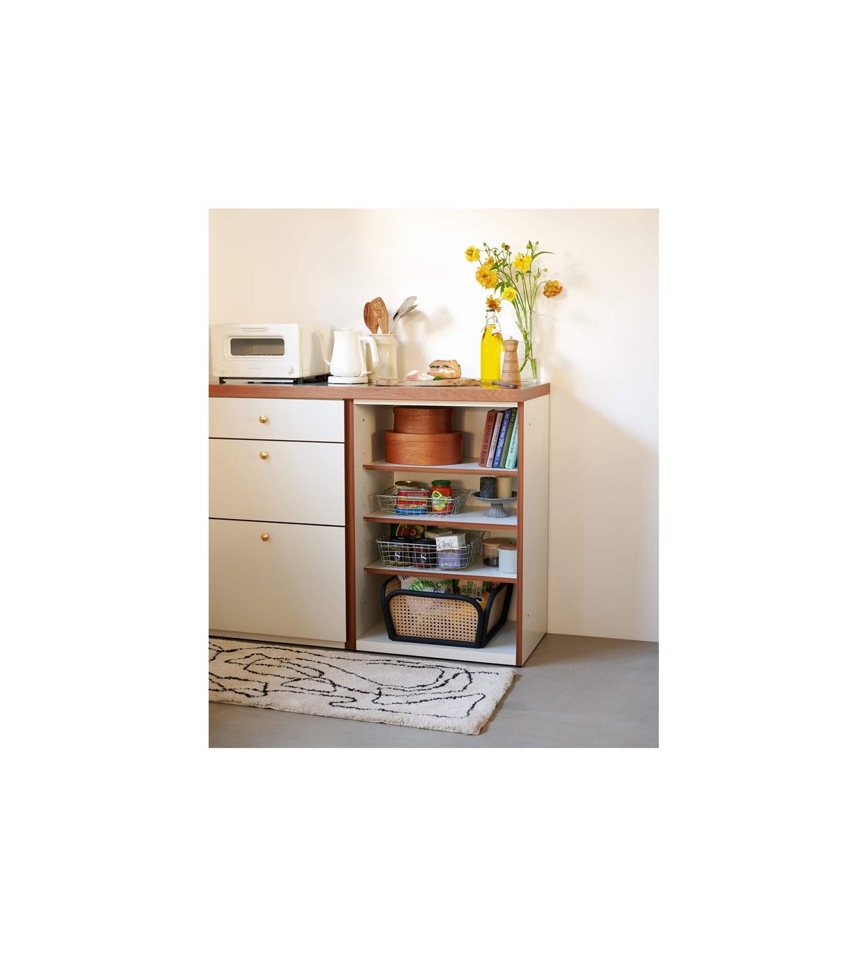 また、組み合わせ次第ではキッチンカウンターとしてだけでなく、ワードローブなどの衣装スペースや、リビングでの収納家具としてもお使いいただける汎用性を備えています。