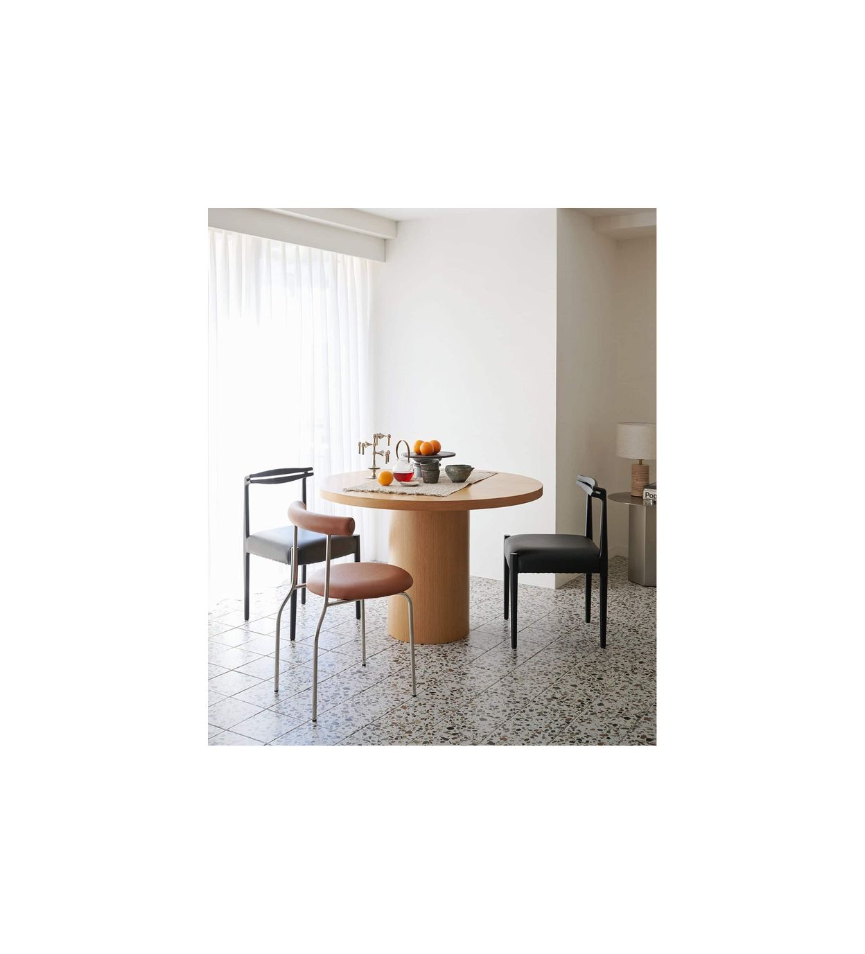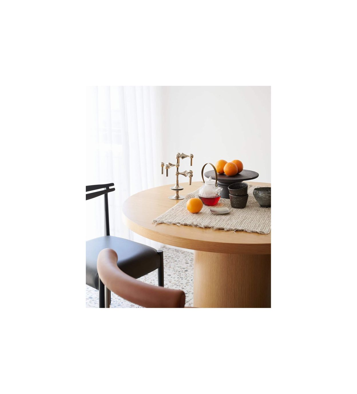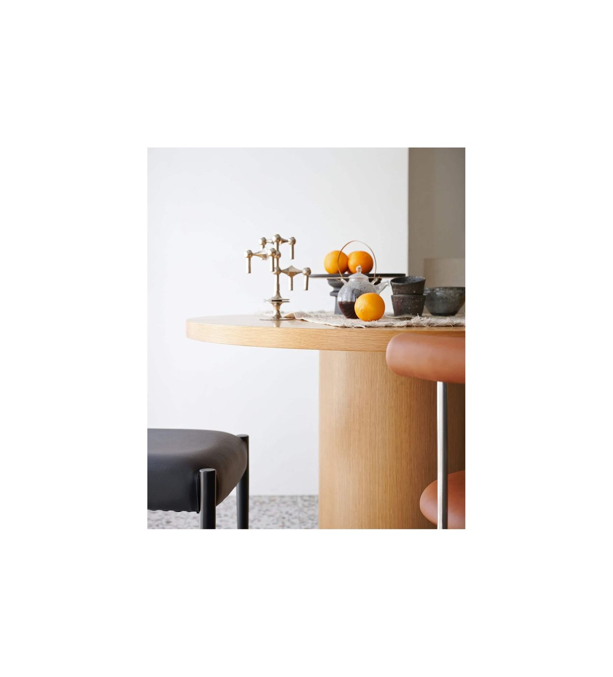 天板の厚みや円柱の脚など、シリーズならではの特徴をそのままに、円形ならではの柔らかな印象をプラスしました。
