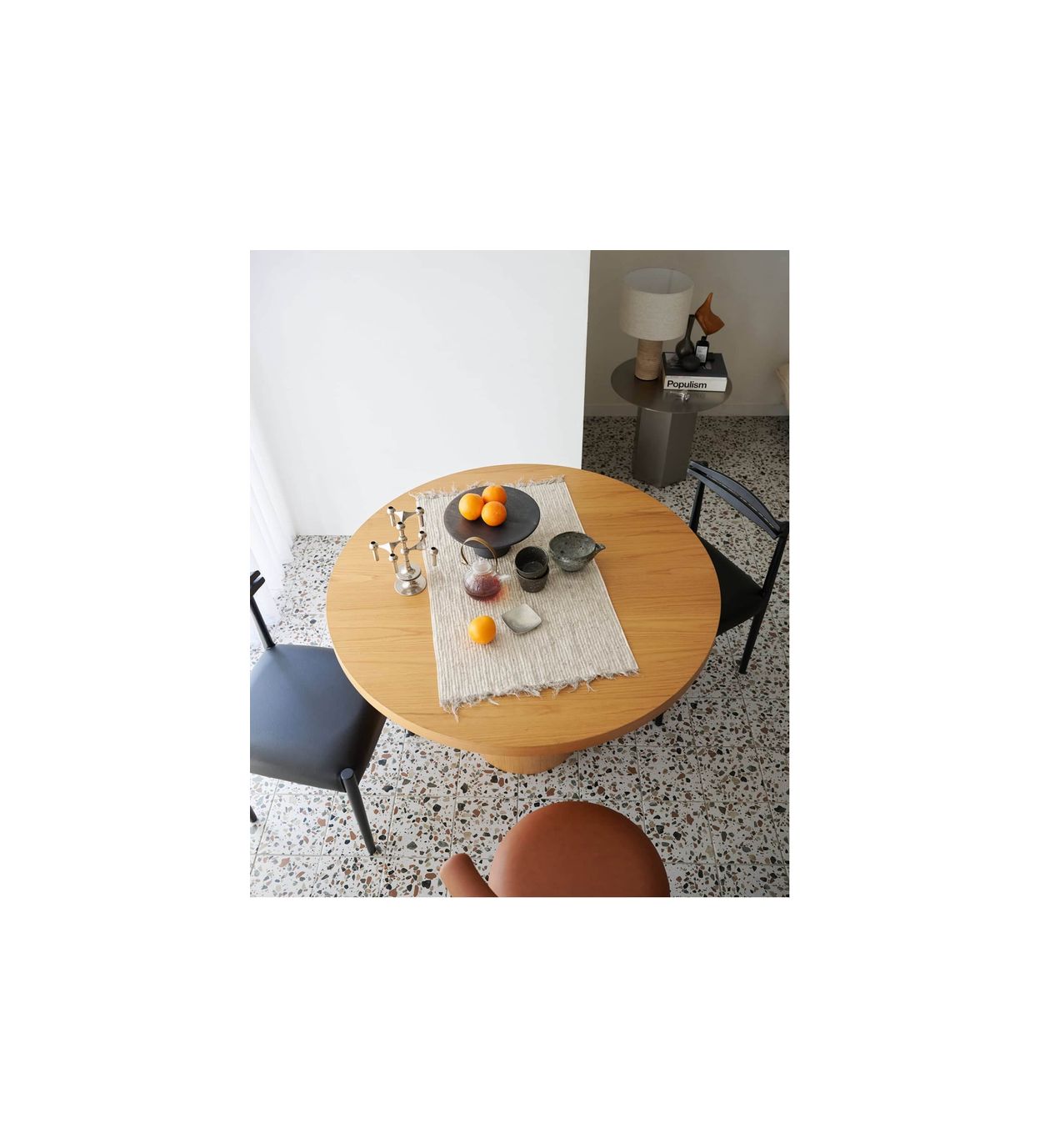 円形の天板は空間にやさしい雰囲気をもたらし、視覚的にも広がりを感じさせます。